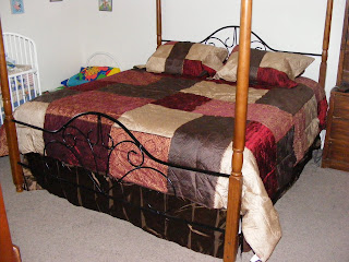 We got a new bed, well kinda. It is new to us. Matt's sister gave us her old bed set. I'm so excited. I have been wanting one, but they are not cheap. After we set up the bed we decided we wanted a new bedding set to go with it. It is the most beautiful thing in our house now. Matt and I both love it. Neither one of us has had really nice stuff growing up so it is something new for both of us to have something we really like.